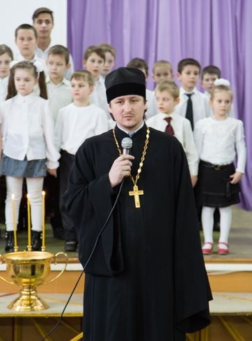 Иеромонах Александр окропил учащихся и гостей святой водой и поздравил всех с предстоящей Пасхой, вручив директору сувенирное пасхальное яйцо от братии обители.