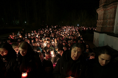 12 апреля 2015 года в Шамординской обители по завершении полунощницы в начале пасхальной заутрени все богомольцы вместе с сестрами обходили монастырский собор с горящими свечами, совершая крестный ход по тому самому пути, по какому предыдущей ночью обносили Плащаницу, совершая чин погребения. Но уже несли праздничные хоругви и икону Воскресения Христова, священники шли в белых облачениях, и за ними следовал поток православных христиан. Когда же по прочтении Евангелия врата собора растворились настежь, словно открытые райские врата, все вошли, освобожденные от греховного рабства Воскресшим Господом Иисусом Христом.