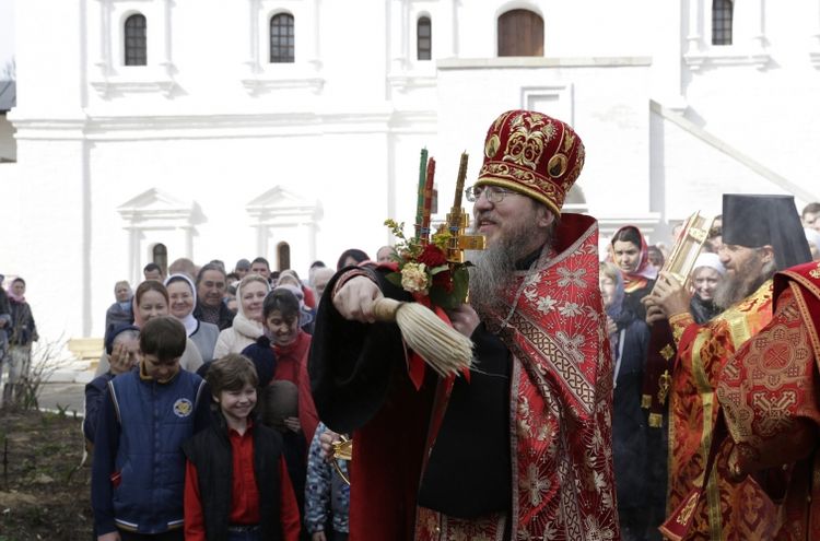 Прихожане обходили крестным ходом против часовой стрелки Рождественский собор обители. По ходу несколько раз останавливались для чтения Евангелия. Священник кропил всех святой водой. Крестный ход сопровождал праздничный колокольный звон.
