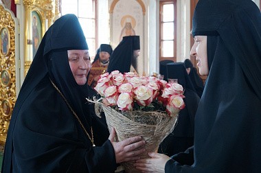 За Божественной литургией молились сестры, прихожане, воспитанницы детского приюта и гости монастыря. Поздравить матушку с юбилейной датой и принять участие в совместной молитве прибыли гости: настоятельница московского подворья Свято-Успенского Пюхтицкого ставропигиального женского монастыря игумения Филарета (Смирнова); настоятельница Покровского Хотькова ставропигиального женского монастыря игумения Олимпиада (Баранова); настоятельница Богородице-Рождественского ставропигиального женского монастыря игумения Викторина (Перминова).