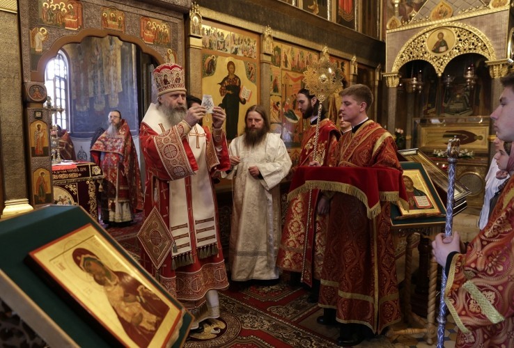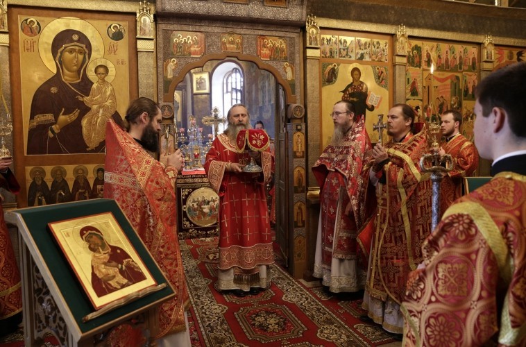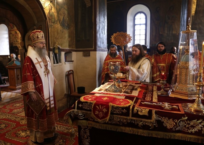 Литургия состоялась в соборе Рождества Пресвятой Богородицы – главном храме монастырского ансамбля.