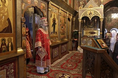 Его Высокопреосвященству сослужили: наместник Саввино-Сторожевской обители архимандрит Савва (Фатеев); духовник монастыря игумен Стефан (Гулинов); скитоначальник игумен Феодосий (Чинадель); благочинный монастыря иеромонах Кирион (Сунцов) и ризничий монастыря иеромонах Амвросий (Быков).