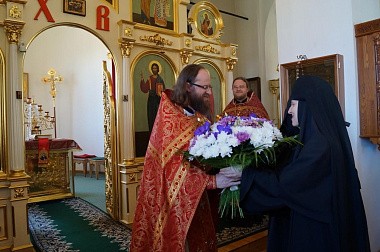 Иерею Георгию в память о торжественном событии вручили картину «Явление Бориса и Глеба», святую просфору и букет цветов. Клирик обители, поблагодарив за поздравления, преподнес в дар настоятельнице монастыря игумении Марии (Солодовниковой) икону Спасителя «Пастырь Добрый», привезенную с Афона, а все пришедшие в этот день на богослужение получили иконочки с изображением Синайского образа Спасителя.