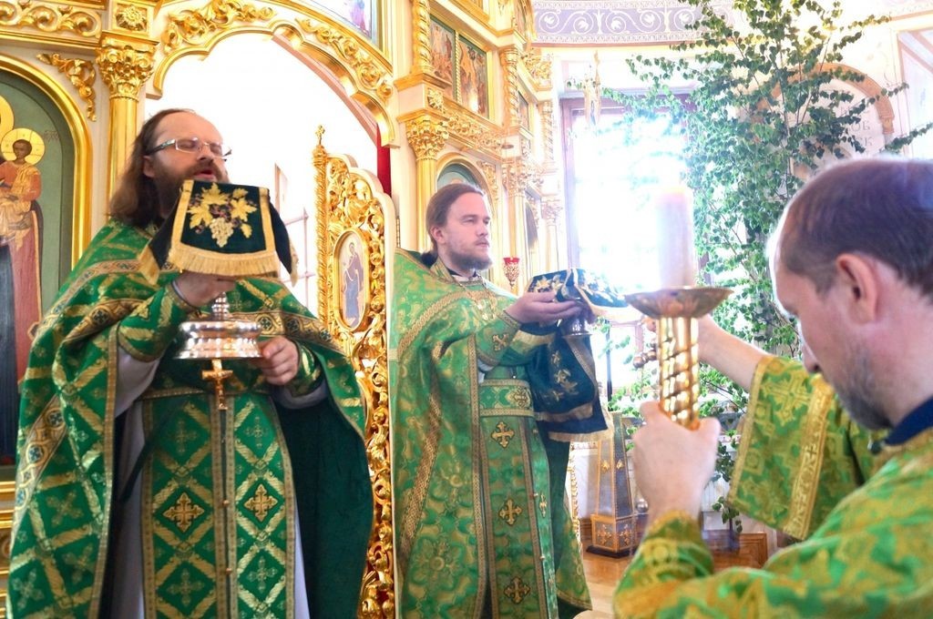 Праздичную великую вечернюсовершили с особыми коленнопреклонными молитвами о ниспослании Духа Святого, Духа премудрости, Духа разума и страха Божия.