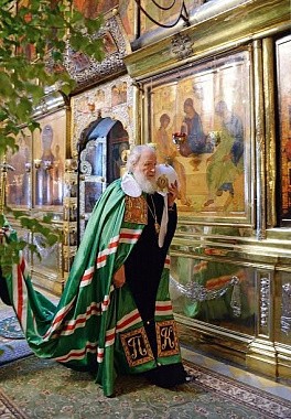 По прибытии в Лавру Святейший Владыка проследовал в Троицкий собор, где поклонился честным мощам преподобного Сергия Радонежского, а также святыням, находящимся в Серапионовой палате.