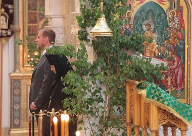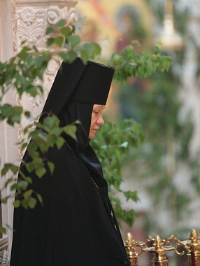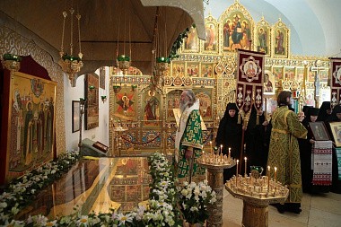 За богослужениемво время сугубойзаупокойной ектении и литии совершалось также молитвенное поминовение Святейшего Патриарха АлексияII, а также насельниц монастыря схимонахини Алексии и монахини Авели, преставившейся в этот день ровно год назад.