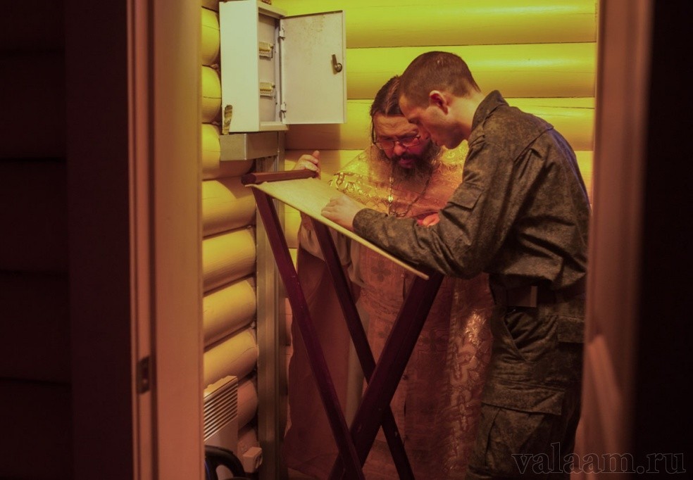 Службы в Георгиевском храме и духовные беседы с военнослужащими проводит помощник игумена Валаамской обители по взаимодействию с вооруженными силами РФ иеромонах Парфений (Шапанов): «Здесь, на Валааме, служат не только верующие и не только православные. Бывают и атеисты. Правда, к концу службы никто из них себя таковыми не считает – происходит изменение мировоззрения. Причем выбор всегда добровольный. Массовость на богослужении – вовсе не наша цель. Богослужение, молитва, Причастие – дело сугубо личное и добровольное. Ведь нам хорошо известно: "невольник – не богомолец". Ни мне, ни тем более Спасителю не нужны люди, собранные в храме по приказу, – сюда солдат приходит по зову сердца.