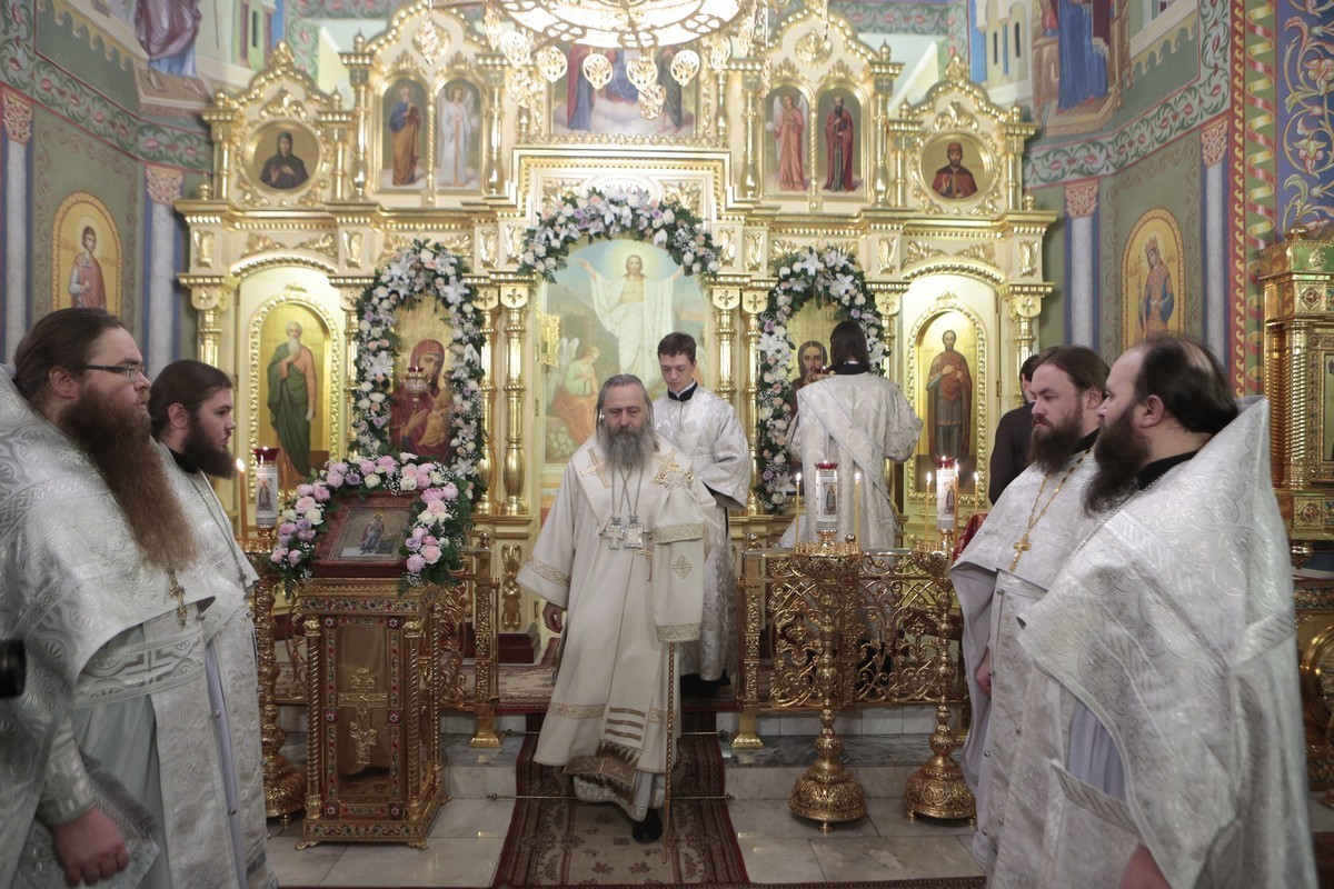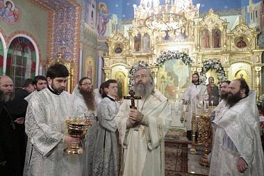 Чин Великого освящения, а затем Божественную Литургию возглавил Высокопреосвященнейший Феогност, архиепископ Сергиева Посада, Председатель Синодального отдела по монастырям и монашеству. Его Высокопреосвященству сослужили игумен Парамон, наместник Донского монастыря, братия Свято-Троицкой Сергиевой Лавры и Донского ставропигиального мужского монастыря.