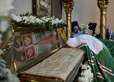7 апреля 2014 года, в праздник Благовещения Пресвятой Богородицы и день преставления святителя Тихона, Патриарха Московского и всея России, Святейший Патриарх Московский и всея Руси Кирилл совершил молебен у раки с мощами святителя в Большом соборе Донского ставропигиального мужского монастыря г. Москвы.