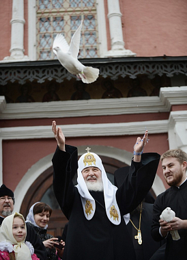 По традиции в день Благовещения Пресвятой Богородицы Святейший Патриарх Кирилл вместе с учащимися воскресной школы Донского монастыря выпустил в небо стаю голубей со ступеней Большого собора.