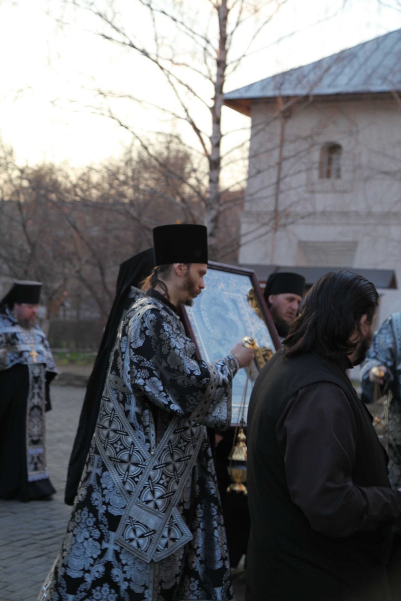 Братия обители под колокольный звон вынесла образ Толгской иконы Божией Матери из Преображенского собора и пронесла через святые врата. Многочисленные богомольцы пришли проводить чудный образ Божией Матери XVIII века.