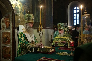 Его Высокопреосвященству в монастырском соборе Рождества Божией Матери сослужили: наместник Саввино-Сторожевского монастыря архимандрит Павел (Кривоногов); настоятель Московского Троицкого подворья Свято-Троицкой Сергиевой лавры архимандрит Стефан (Тараканов), заместитель председателя Синодального отдела по монастырям и монашеству; настоятель Московского подворья Введенского ставропигиального мужского монастыря Оптина пустынь архимандрит Мелхиседек (Артюхин), пресс-секретарь Синодального отдела по монастырям и монашеству; генеральный директор Патриаршего издательско-полиграфического Центра архимандрит Алипий (Кастальский-Бороздин); насельник Свято-Троицкой Сергиевой лавры архимандрит Диодор (Дидковский); благочинный Звенигородского округа Московской областной епархии протоиерей Николай Курдов; настоятель подворья «Куликово поле» Свято-Троицкой Сергиевой лавры игумен Христофор (Бойчук); братия монастыря, подворий и гости обители в священном сане.