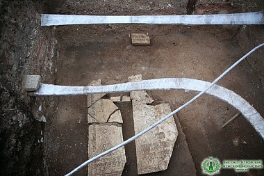 Археологические исследования уже позволили обнаружить участок неповрежденного кладбища с исключительно ценным комплексом надгробий. В центре раскопа были найдены две плиты начала XVI века с очень красиво нарезанным текстом – датой смерти 31 июля 1512 года (день памяти преподобного Евдокима).