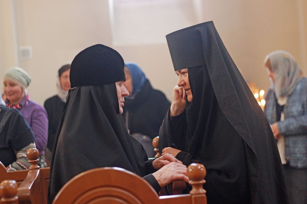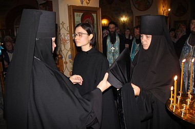 Накануне в Иерусалимском храме было совершено всенощное бдение. За богослужением по окончании кафизмы настоятельница монастыря игумения Екатерина (Чайникова) одела в связку насельницу обители послушницу Калису.