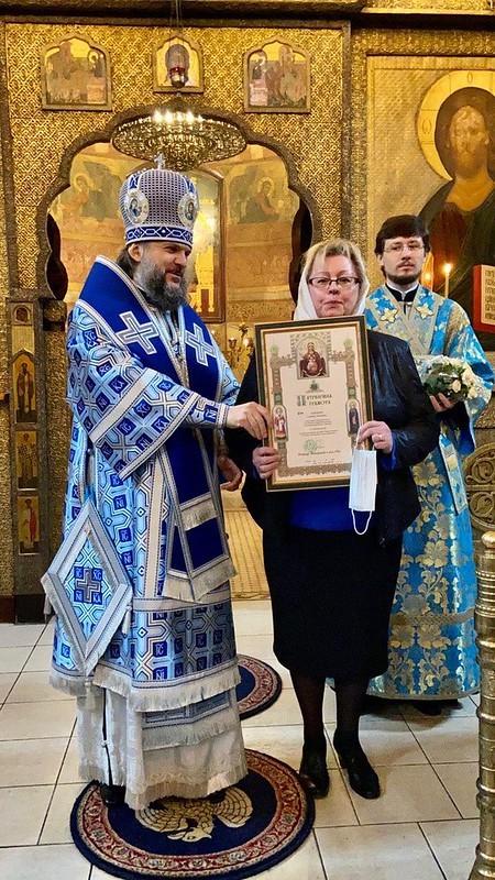 После поздравительной речи архиепископ Амвросий вручил Патриаршие грамоты монаху Гавриилу (Чумаченко), начальнику скита преподобного Серафима Саровского Сретенского монастыря, и Галине Зайцевой, сотруднице Сретенского монастыря.