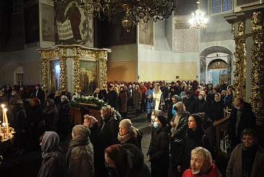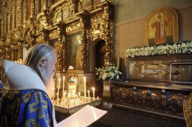 В завершение богослужения Преосвященнейший владыка с братией обители совершили молебен перед мощами святителя Тихона.