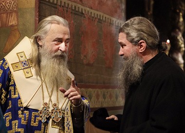 Его Высокопреосвященству сослужила братия обители в священном сане.