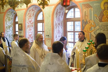 Его Высокопреосвященству сослужили: благочинный Троице-Сергиевой Лавры архимандрит Павел (Кривоногов); настоятель храма в честь Явления Пресвятой Богородицы преподобному Сергию Радонежскому Лаврского подворья иеромонах Феофилакт (Кириллов); братия Лавры в священном сане; клирики храма иереи Александр Пивняк и Евгений Веселов, а также духовенство в диаконском чине.