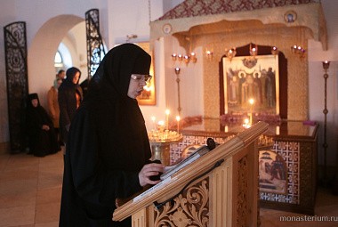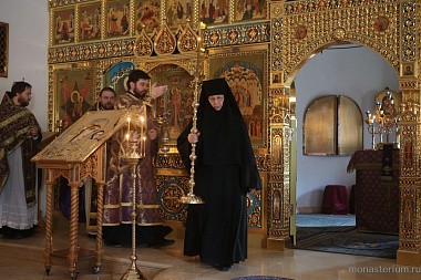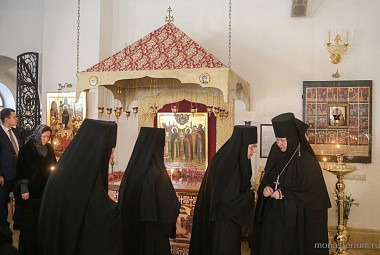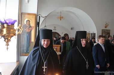 За богослужением молились: заместитель председателя Синодального отдела по монастырям и монашеству, настоятельница Зачатьевского ставропигиального женского монастыря игумения Иулиания (Каледа) с сестрами; настоятельница Богородице-Рождественского ставропигиального женского монастыря игумения Викторина (Перминова), а также почетные гости, прибывшие по приглашению Высокопреосвященнейшего владыки на архиерейское богослужение, и постоянные прихожане и паломники монастыря.