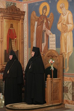 По окончании Литургии владыка Феогност зачитал поздравление Святейшего Патриарха Московского и всея Руси Кирилла игумении Олимпиаде по случаю ее дня Ангела с пожеланием многолетия и помощи Божией в управлении древней Хотьковской обителью.