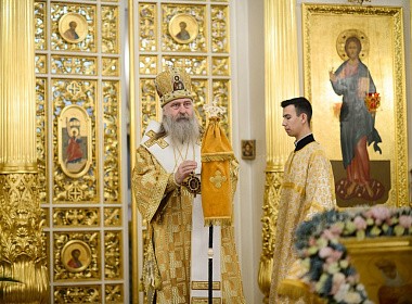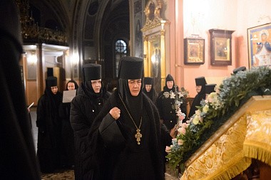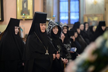 За Божественной литургией Его Высокопреосвященству сослужили заместитель председателя Синодального отдела по монастырям и монашеству архимандрит Стефан (Тараканов), клирики Покровской обители, священнослужители, приехавшие поздравить игумению Феофанию.