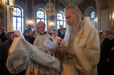 По завершении богослужения владыка Феогност огласил поздравление Святейшего Патриарха Московского и всея Руси Кирилла в адрес игумении Феофании: