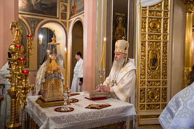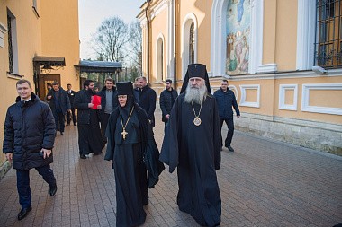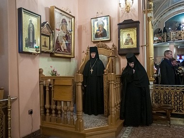Далее насельницы обители сопроводили архипастыря к мощам блаженной Матроны Московской, где было совершено славление и прочитана молитва святой старице.