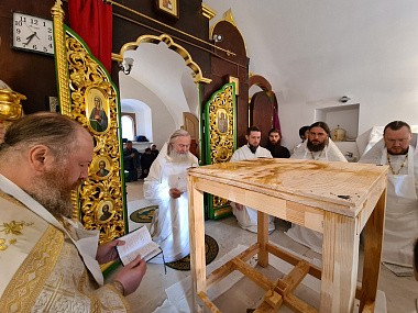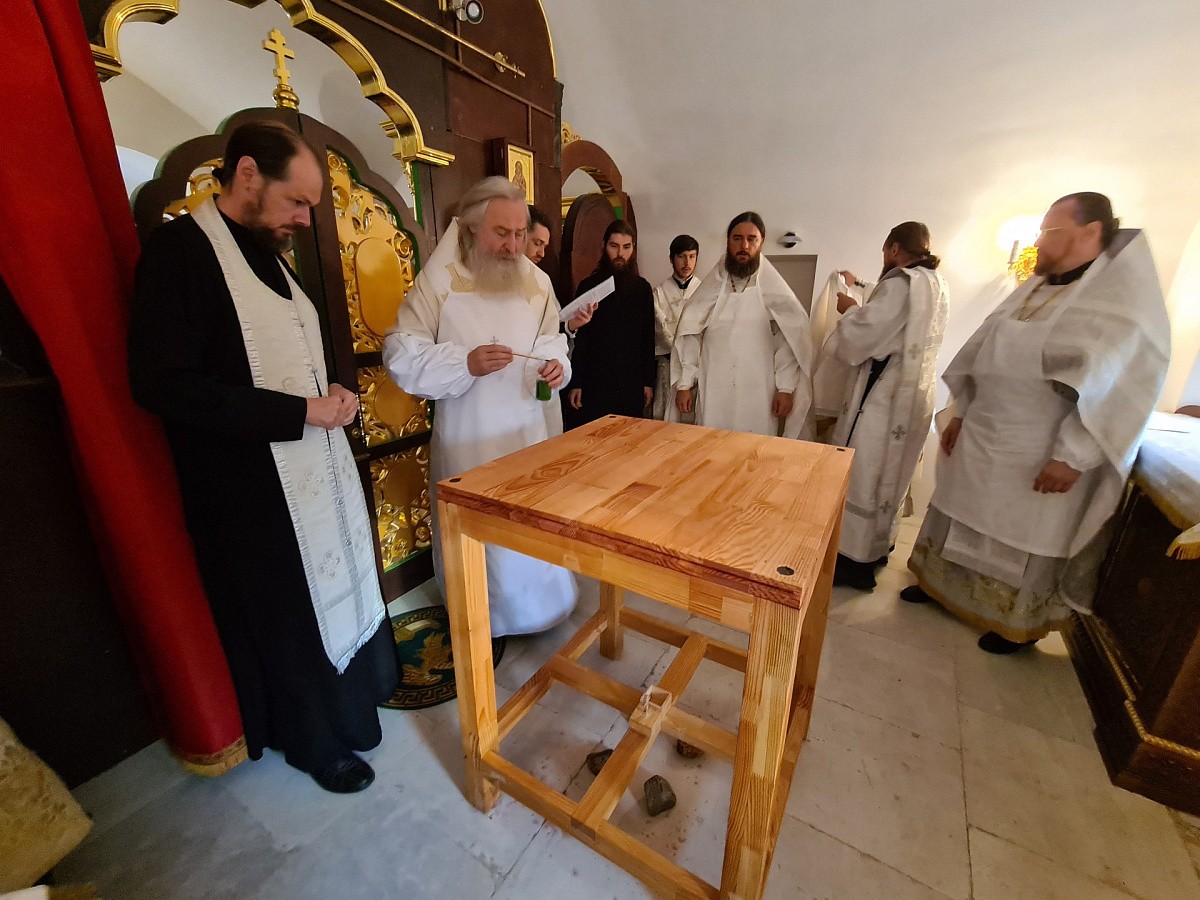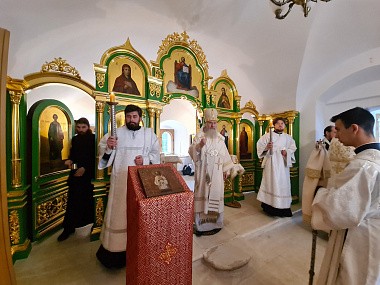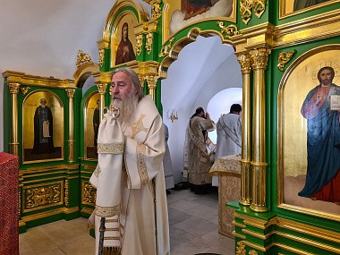 Его Высокопреосвященству сослужили: наместник Саввино-Сторожевского ставропигиального мужского монастыря архимандрит Павел (Кривоногов); благочинный ставропигиальных приходов и Патриарших подворий вне Москвы, настоятель храма прп. Сергия Радонежского на Рязанке протоиерей Виктор Сандар; настоятель Патриаршего подворья храма иконы Божией Матери «Спорительница хлебов» в п. Приазовский Темрюкского района Краснодарского края игумен Пантелеимон (Гудин); братия обители в священном сане.
