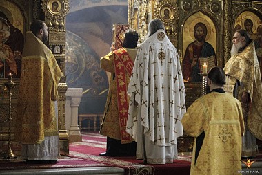 Его Высокопреосвященству сослужили настоятель подворья игумен Арсений (Мосалев), духовенство и братия обители.