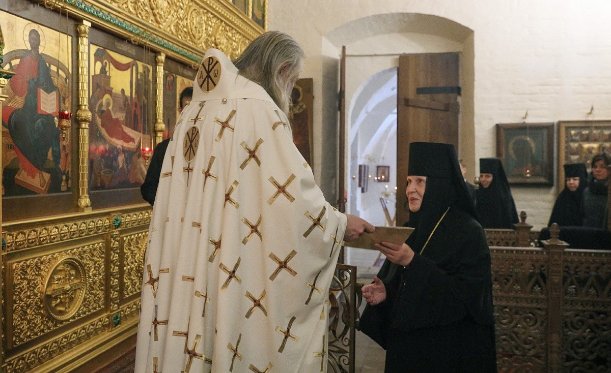 Многие годы Вы трудитесь на пользу Матери-Церкви. Восприняв обручение ангельского образа (последование монашеского пострига) и отринув все мирское, Вы стали усердно исполнять различные послушания в Пюхтцкой обители. Спустя годы Господь призвал Вас к игуменскому деланию в столичном Богородице-Рождественском женском монастыре, в возрождении которого Вы приняли деятельное участие и в котором доныне со тщанием совершаете настоятельское служение.