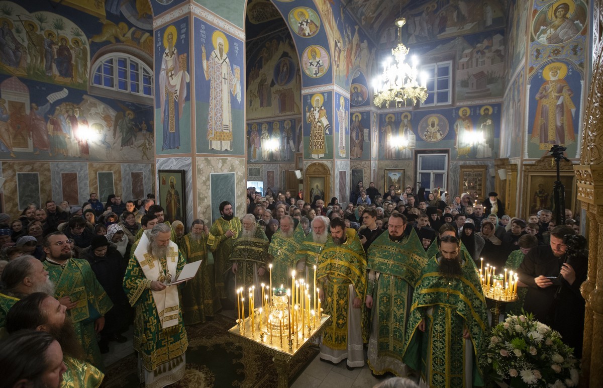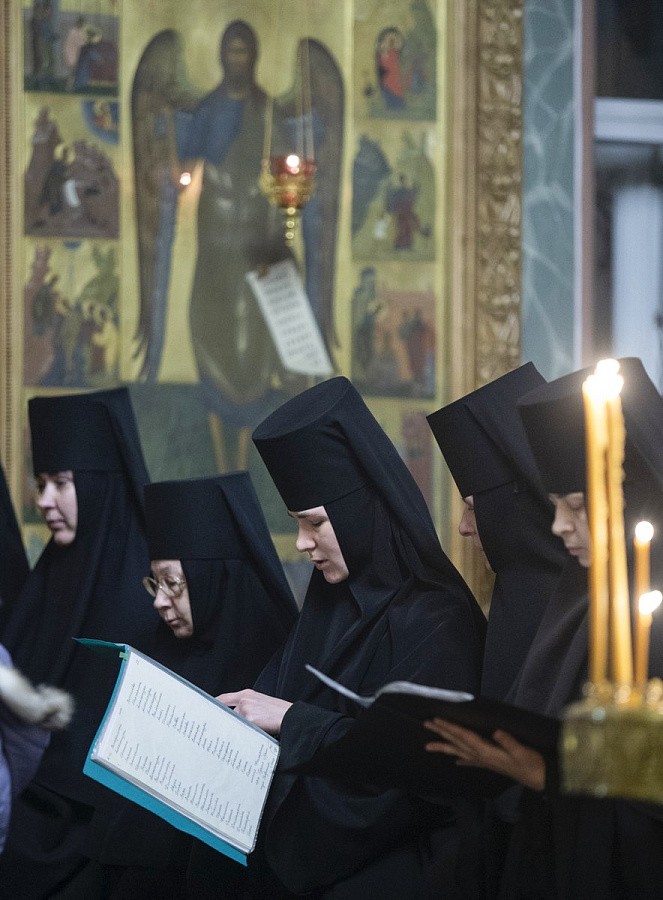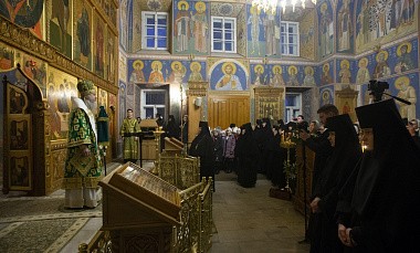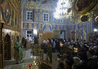 Накануне была отслужена малая вечерня с акафистом преподобным Кириллу и Марии. Всенощное бдение совершил архимандрит Макарий (Веретенников), насельник Троице-Сергиевой лавры, профессор Московской духовной академии, член Синодальной литургической комиссии.