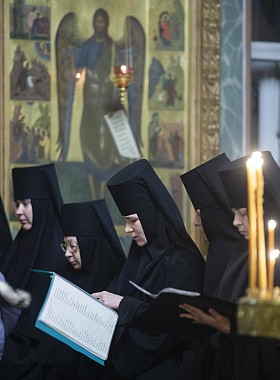 Церковные песнопения исполнили: за ранней Литургией – хор воспитанниц и выпускниц Православного детского пансиона при монастыре, за поздней – хор сестер обители.