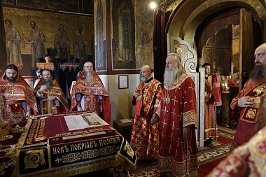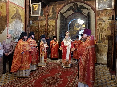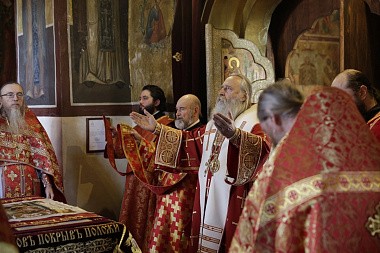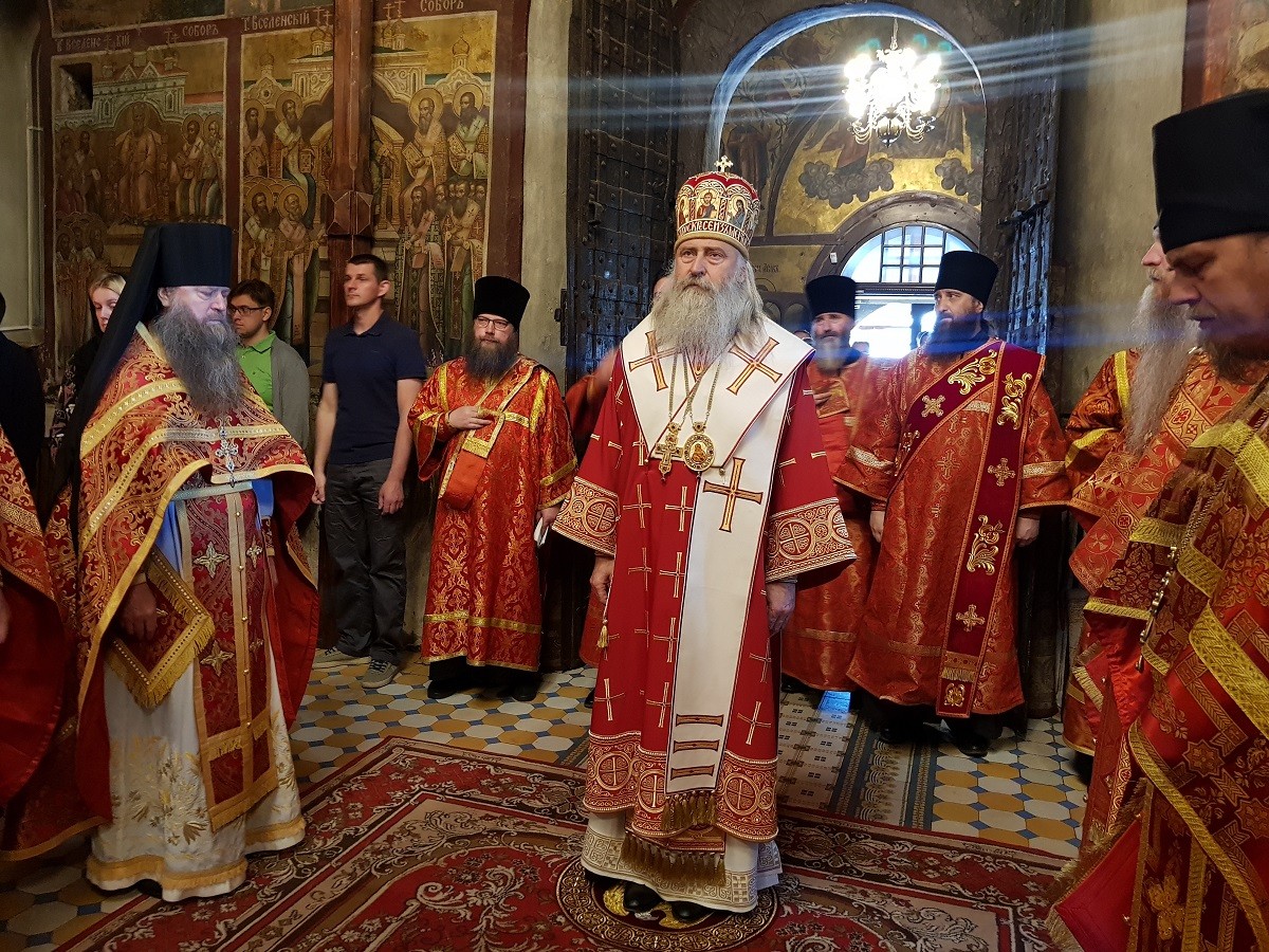 В соборе Рождества Божией Матери Его Высокопреосвященству сослужили наместник монастыря архимандрит Савва (Фатеев), скитоначальник Голгофо-Распятского Анзерского скита Спасо-Преображенского Соловецкого ставропигиального мужского монастыря игумен Евлогий (Стручилин), братия монастыря в священном сане.