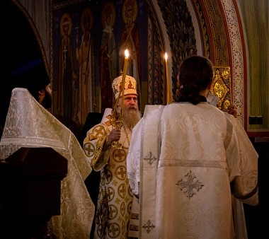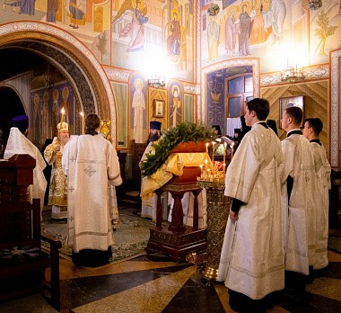 В завершение архиепископ Феогност произнес проповедь на тему толкования евангельского чтения об изгнании торгующих из храма.