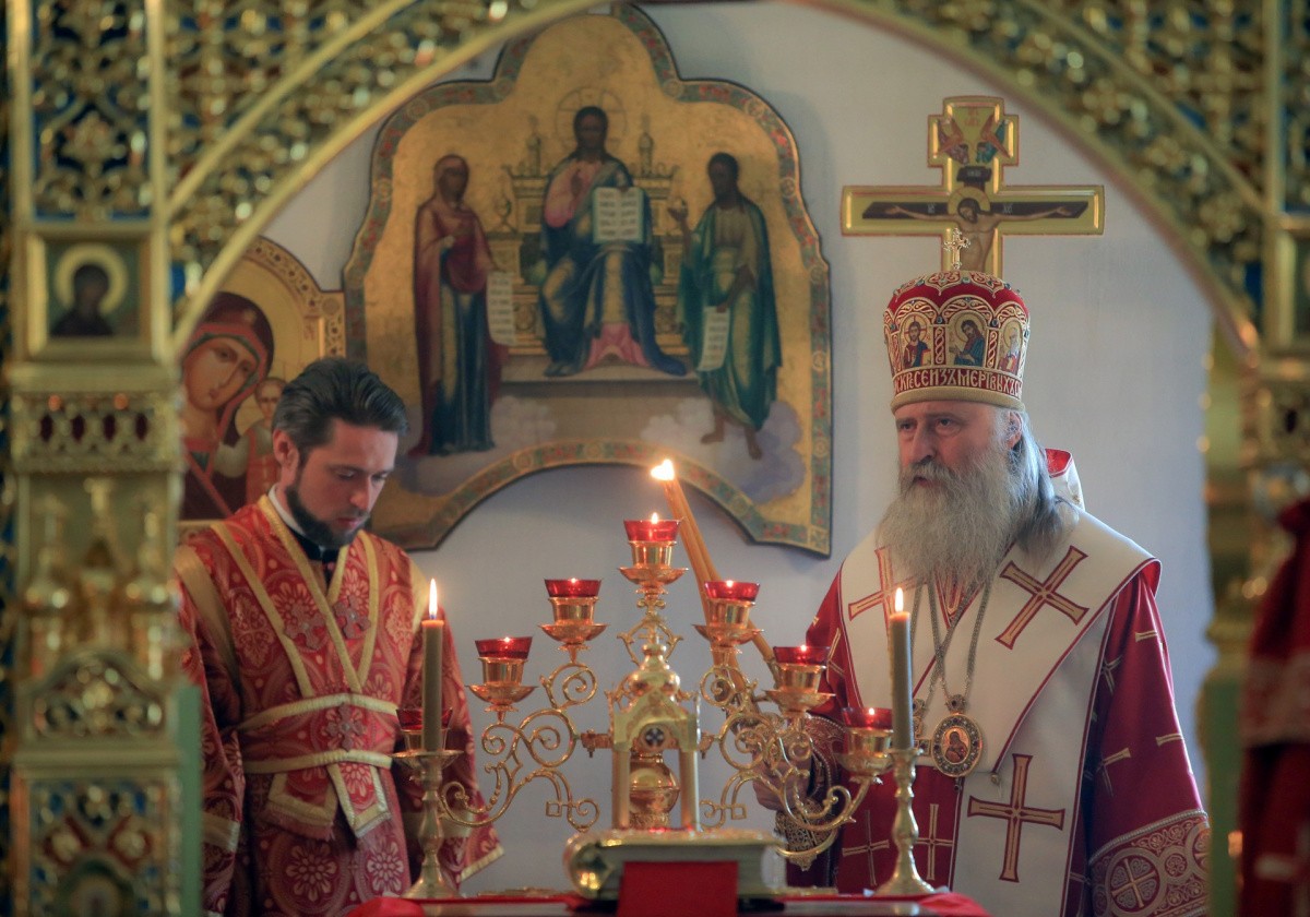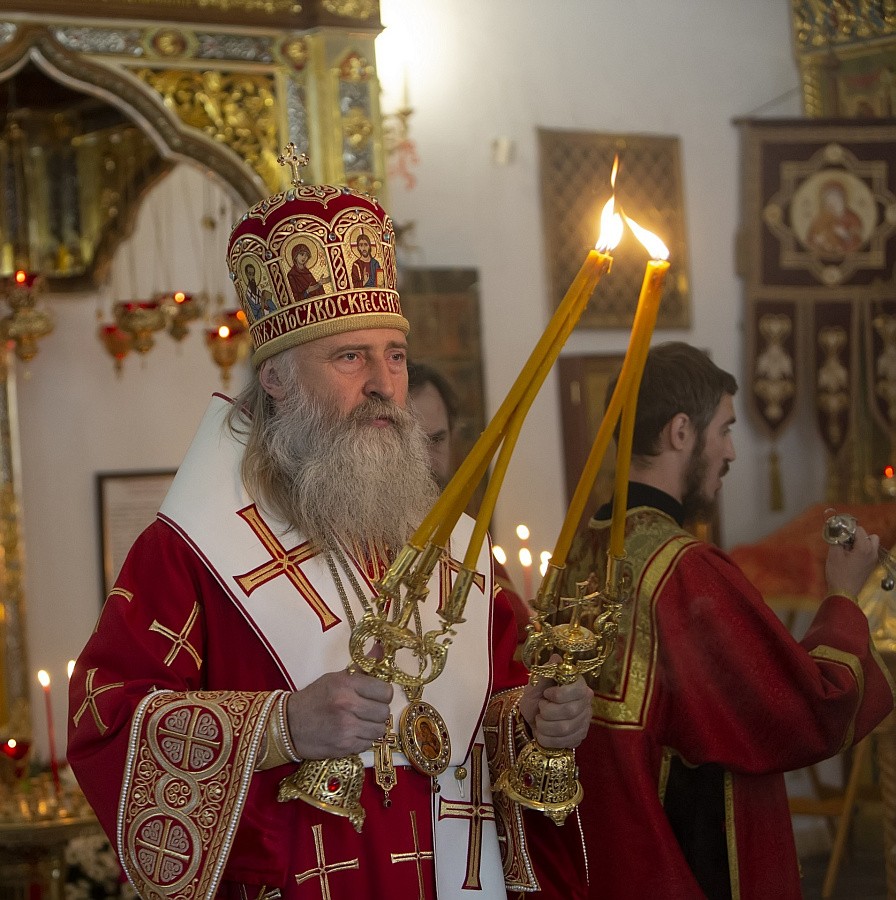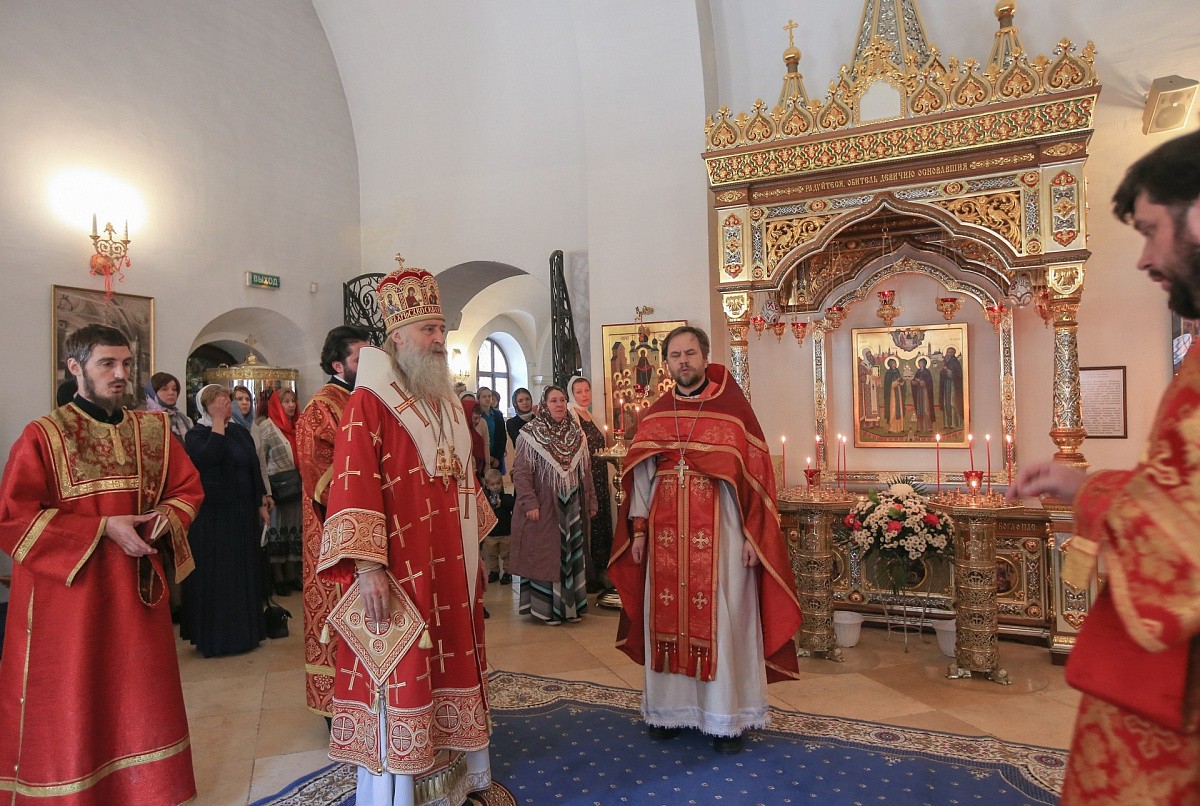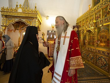 В Казанском приделе монастырского собора Рождества Пресвятой Богородицы Его Высокопреосвященству сослужило духовенство обители.