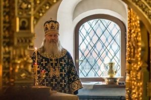 В Казанском приделе монастырского собора Рождества Пресвятой Богородицы Его Высокопреосвященству сослужили клирики обители.