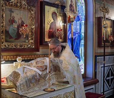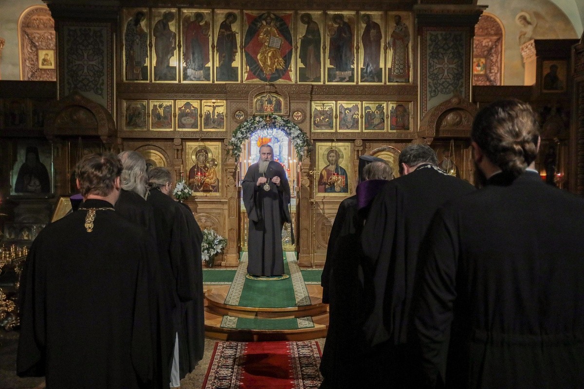 Его Высокопреосвященству сослужили игумен Иосиф (Крюков), начальник Московского Валаамского подворья; архимандрит Иоанн (Коган), руководитель фонда св. вмц. Екатерины; священник Иоанн Цьока, настоятель храма Преображения Господня в поселке Коммунарка; иерей Илия Соловьев, настоятель храма святого великомученика Георгия Победоносца в Московском; братия Валаамской обители и подворья в священном сане.