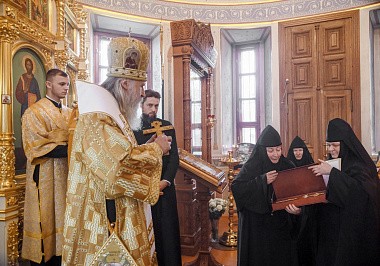 По окончании Литургии архиепископ Феогност передал благословение и поздравление Святейшего Патриарха Московского и всея Руси Кирилла настоятельнице Борисоглебского Аносина ставропигиального женского монастыря игумении Марии (Солодовниковой) с 15-летием настоятельства вверенной ей обители.