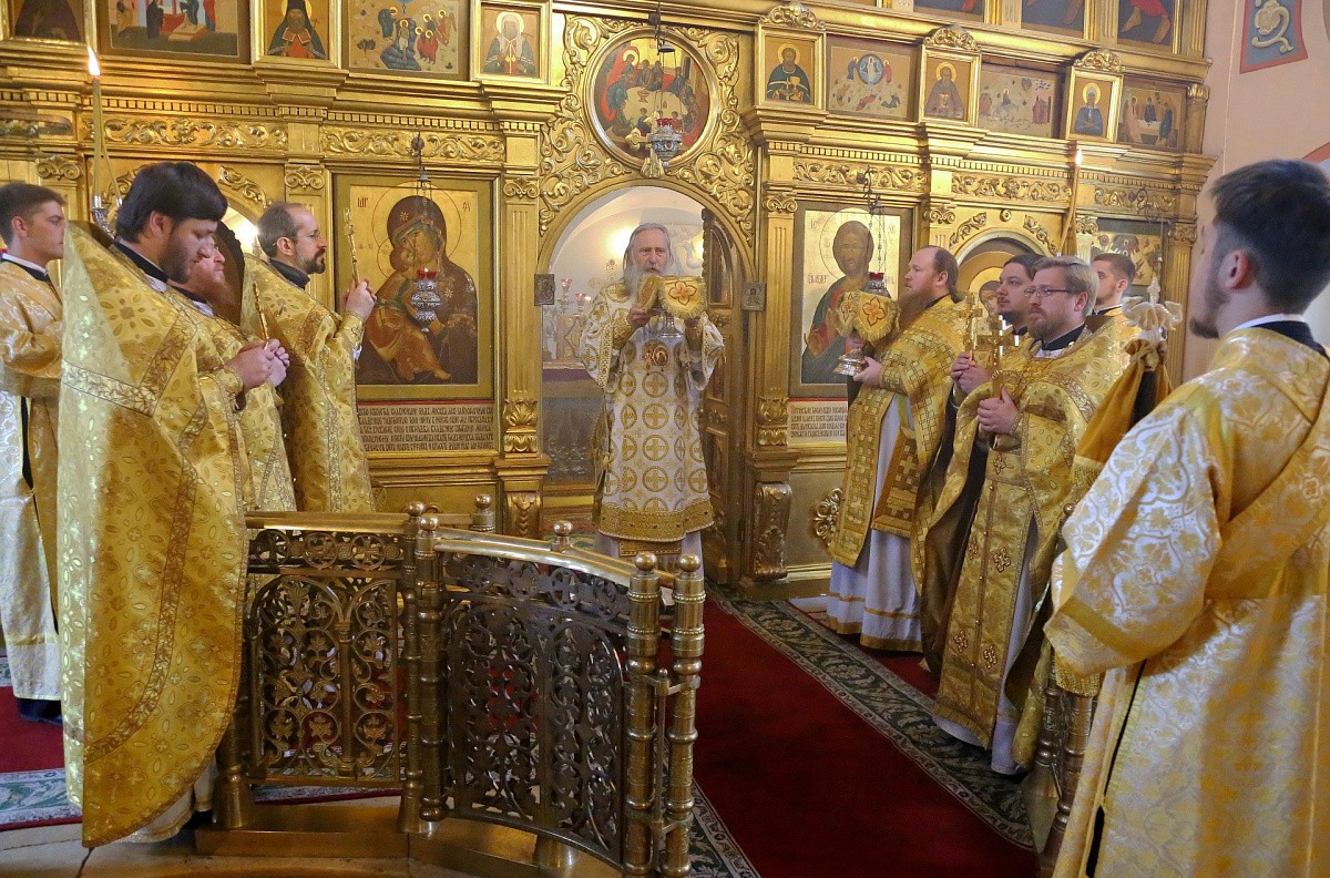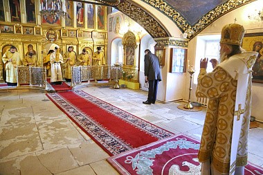 За богослужением в Успенском храме монастыря Его Высокопреосвященству сослужили наместник монастыря игумен Варфоломей (Петров) и духовенство обители.