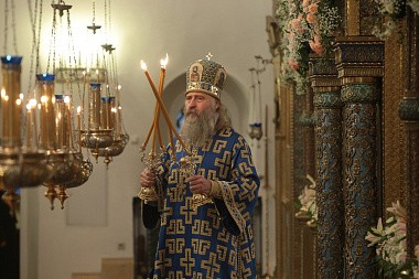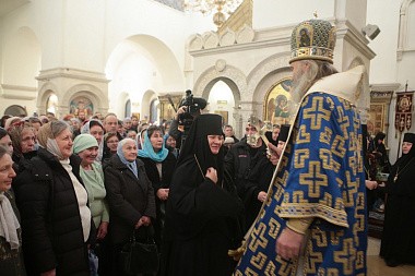 В этот день праздничную Божественную литургию в главном соборе обители возглавил Председатель Синодального отдела по монастырям и монашеству архиепископ Сергиево-Посадский Феогност.