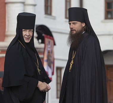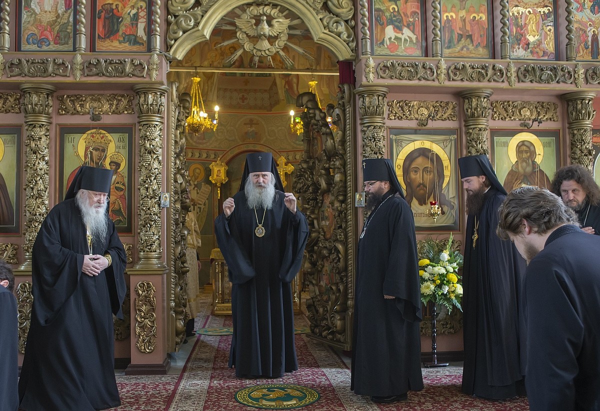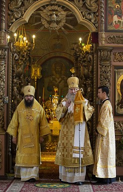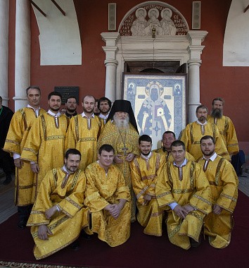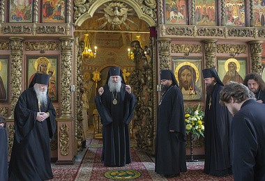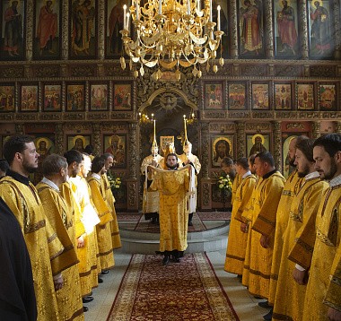 Его Высокопреосвященству за Божественной литургией в Сергиевском храме обители сослужили: викарий Святейшего Патриарха Московского и всея Руси архиепископ Егорьевский Матфей, наместник Высоко-Петровского монастыря игумен Петр (Еремеев), настоятель подворья Троице-Сергиевой лавры в пос. Горки-8 архимандрит Дорофей (Вечканов), настоятель Князь-Владимирской мужской пустыни в с. Корсунь игумен Силуан (Фирсов), братия Высоко-Петровского монастыря в священном сане.