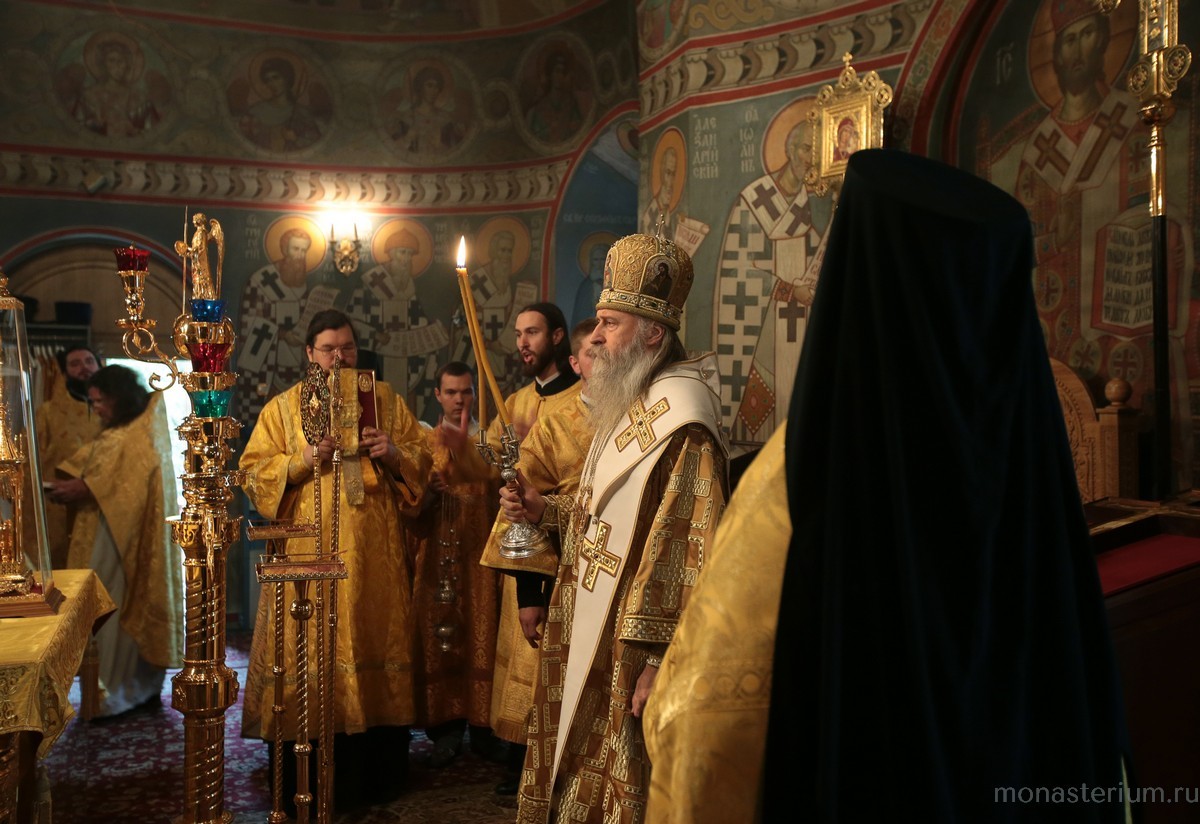 Его Высокопреосвященству сослужили: игумен Петр (Еремеев), наместник Высоко-Петровского ставропигиального мужского монастыря; архимандрит Дорофей (Вечканов), настоятель Одинцовского подворья Свято-Троицкой Сергиевой Лавры; протоиерей Михаил Крутинь, духовник сестричества милосердия во имя Святителя Петра, митрополита Московского; протоиерей Михаил Исаев, клирик храма Великомученика Димитрия Солунского; иерей Богдан Глюза, клирик Казанского храма г. Нерюнгри Якутской епархии; иеромонах Трифон (Умалатов), насельник Свято-Донского Старочеркасского мужского монастыря, и братия монастыря в священном сане.