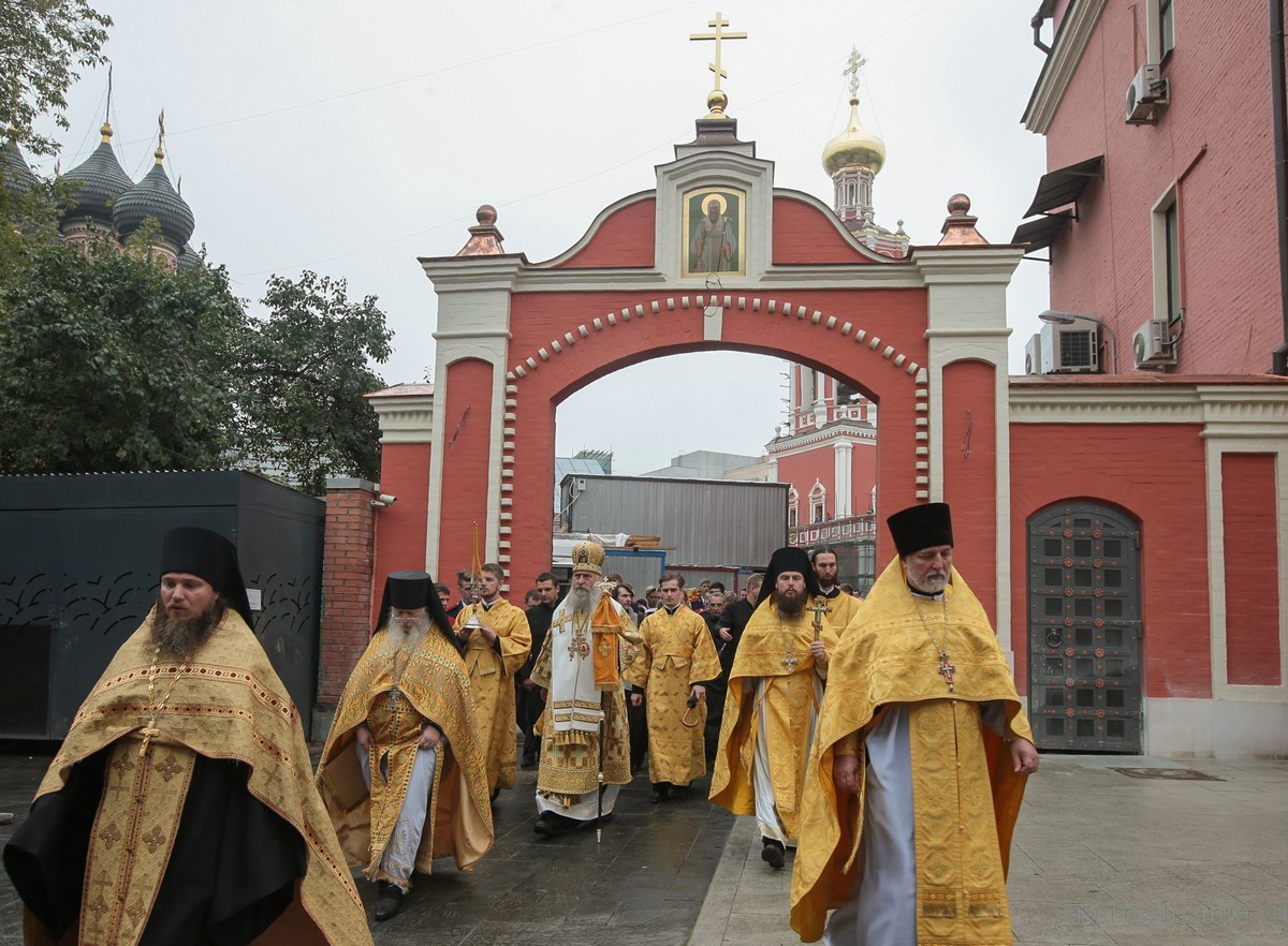 Затем из храма вышел крестный ход, который направился к вратам обители, выходящим на Петровский бульвар. Основная часть работ по их восстановлению завершилась накануне праздника. Духовенство и миряне обошли монастырь с хоругвями и пением молитвы. По традиции главную святыню монастыря – ростовую икону первого московского митрополита святителя Петра – несли участники братства «Сыны Афона».
