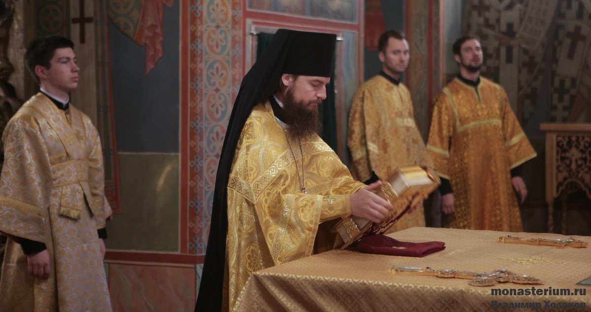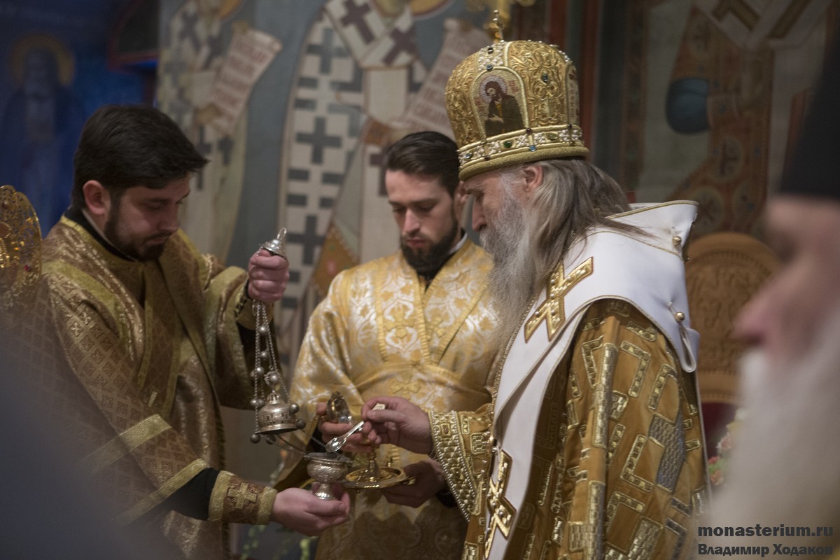 За Божественной литургией Его Высокопреосвященству сослужили: наместник Высоко-Петровского монастыря игумен Петр (Еремеев); настоятель подворья Свято-Троицкой Сергеевой лавры в пос. Горки-8, духовник общественной организации «Сыны Афона» архимандрит Дорофей (Вечканов); клирик храма Великомученика Димитрия Солунского в с. Дмитровское протоиерей Михаил Исаев; клирик храма Воскресения Словущего на Ваганьковском кладбище иерей Сергий Матюшин; клирик храма Апостола Иоанна Богослова, домового храма Российского Православного университета, иерей Владимир Джураc; помощник благочинного Высоко-Петровского монастыря иеромонах Лаврентий (Полешкевич).