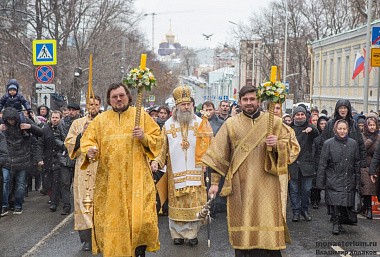 По завершении крестного хода архиепископ Феогност передал собравшимся поздравление Святейшего Патриарха Московского и всея Руси Кирилла с престольным праздником обители и его первосвятительское благословение. В своем архипастырском слове владыка Феогност поприветствовал наместника Высоко-Петровского монастыря, братию и прихожан обители и поздравил их с празднуемым торжеством, а также отметил, что особенно радостно видеть изменения во внешнем облике монастыря – результаты реставрационных и ремонтных работ, которые с каждым разом всё более заметны.