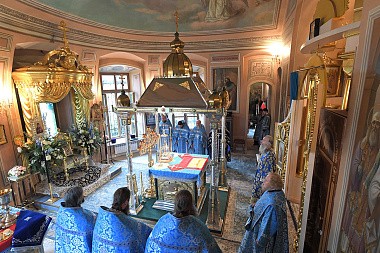 Его Высокопреосвященству сослужили: заместитель председателя Синодального отдела по монастырям и монашеству архимандрит Стефан (Тараканов); протопресвитер Владимир Диваков, секретарь Патриарха Московского и всея Руси по г. Москве, и клирики обители.