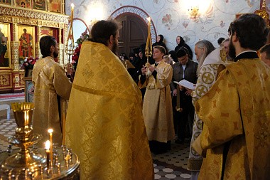 Его Высокопреосвященству сослужили и.о. наместника Заиконоспасского ставропигиального мужского монастыря иеромонах Даниил (Константинов) с братией в священном сане.