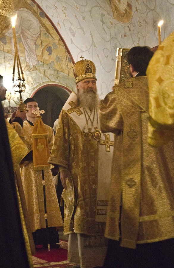 Перед началом богослужения Владыка совершил заупокойную литию по приснопамятному архимандриту Петру (Афанасьеву), бывшему наместником Заиконоспасского ставропигиального мужского монастыря и духовником и строителем Акатовской обители.