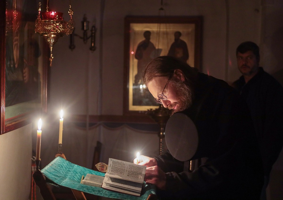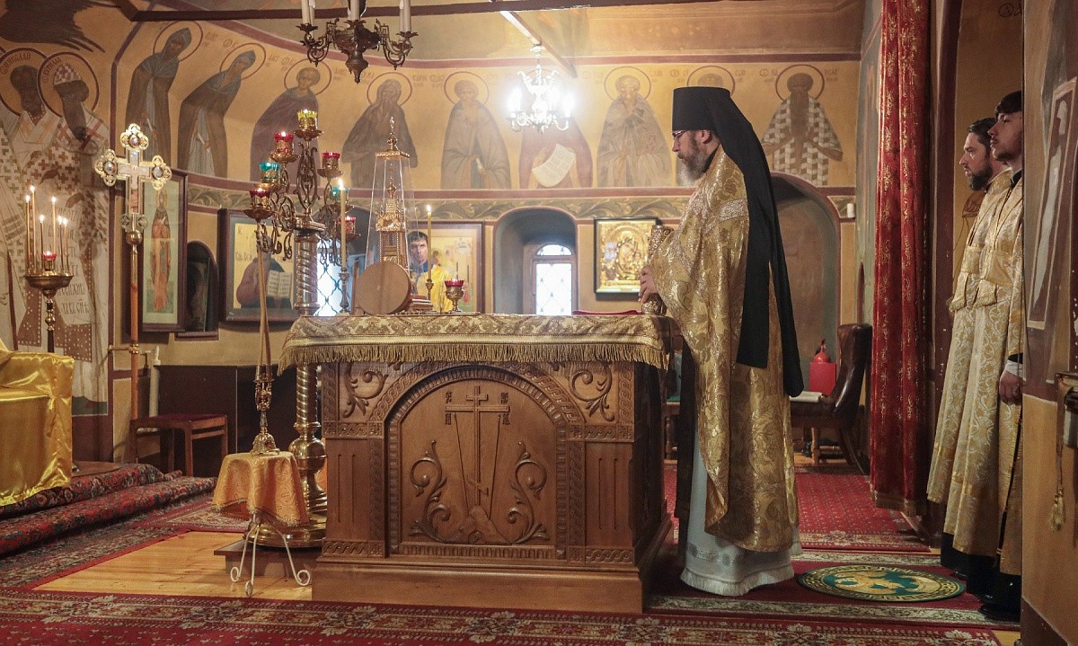 Его Высокопреосвященству сослужили и. о. наместника Заиконоспасского монастыря иеромонах Даниил (Константинов), братия обители в священном сане.