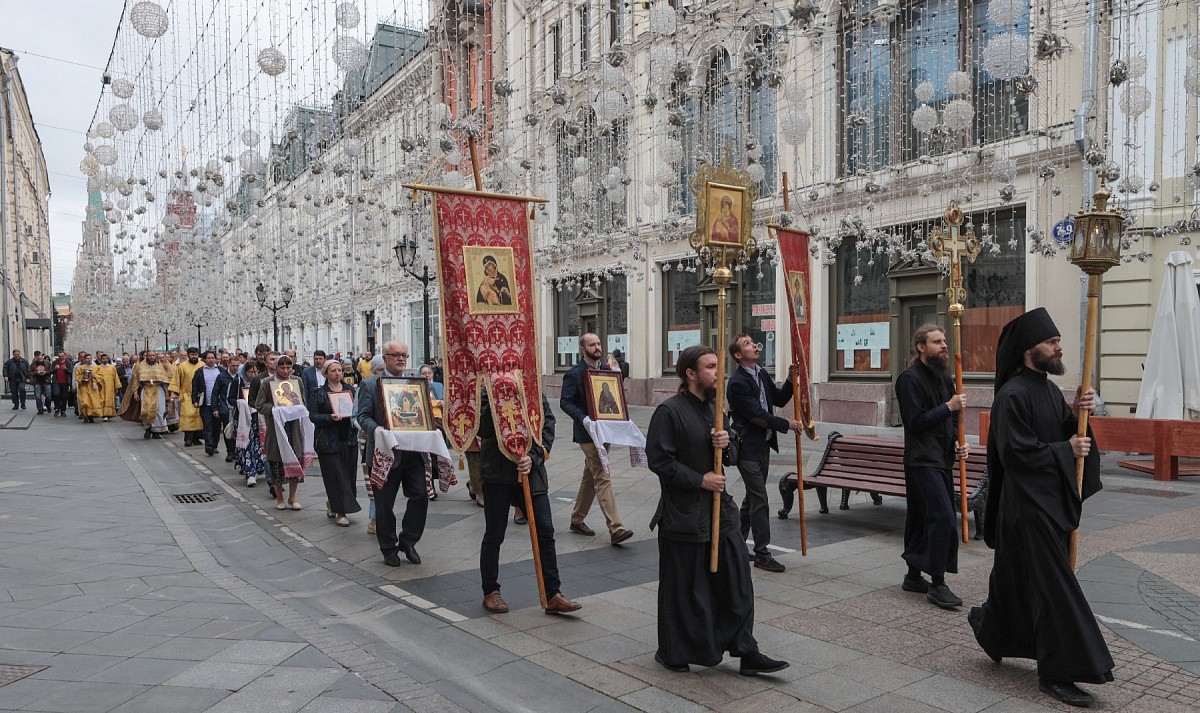 По заамвонной молитве состоялся крестный ход. Торжественная процессия прошла от Заиконоспасского монастыря по Никольской улице к месту, где находился Николо-Греческий монастырь, затем к Воскресенским воротам, далее к Казанскому собору на Красной площади и возвратилась в Заиконоспасский монастырь.
